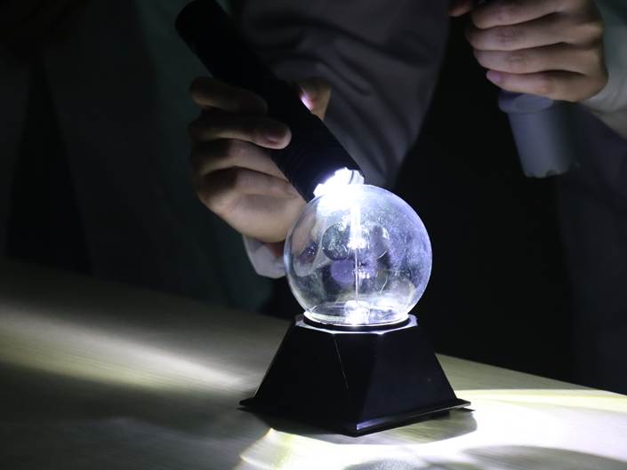 活动围绕“光绘奇妙魔法,智启科学童心”主题,设计了四个层层递进的趣味实验。“全息投影”实验中,科普志愿者利用透明金字塔与平板影像,配合光的反射原理,让“小哪吒”立体悬浮在空中,重现博物馆般的视觉奇迹;“光影追声”环节则借助气球膜、镜片与激光,将声音振动转化为墙面上舞动的光斑,让“看不见的声音”显形;在“水流导光”演示中,激光沿弯曲水流传播,展现光在介质中的全反射现象;而“克鲁克斯辐射计”则通过光照下真空罩内黑白叶片的旋转,生动诠释光能转化为动能的科学原理。每个实验后,孩子们化身“小小科学家”,亲手操作仪器、观察现象、提出问题,在“做中学”的过程中理解光学知识,现场惊呼与掌声不断。